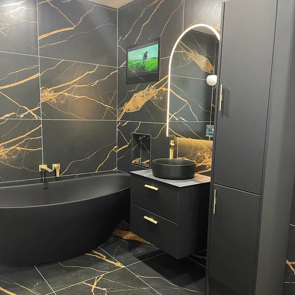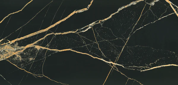 The Black Gold collection is a black marble-effect glazed porcelain tile featuring distinctive gold veining and rectified edges for precise installation with narrow grout lines. This 60x120cm tile can be applied in residential and commercial interiors, the range is available in matt and polished finishes, offering durable performance and a high-end decorative finish for bathrooms, kitchens, and living spaces. Suitable for walls and floors.