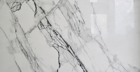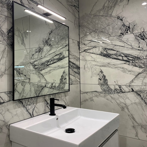 Elegant marble tile showcasing a striking and bold black vein pattern that adds a touch of sophistication. Crafted from polished porcelain, this 60x 120cm tile offers a sleek and refined finish perfect for enhancing any space with a luxurious feel. Suitable for walls & floors.