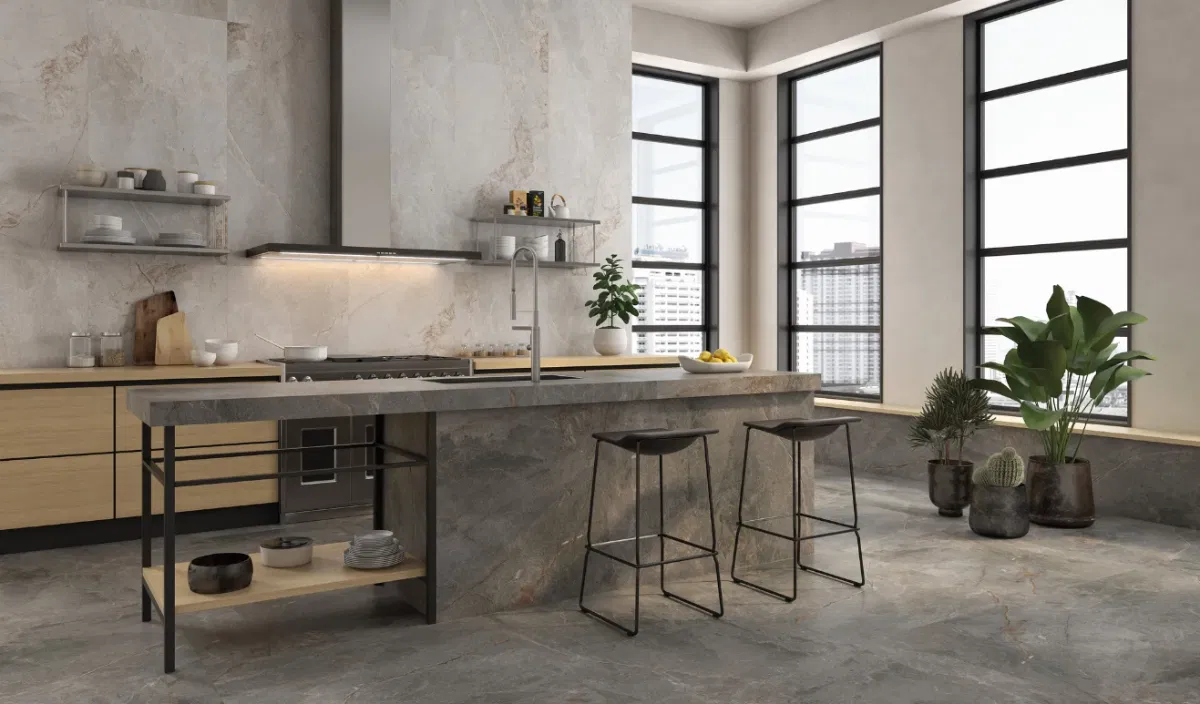 Greige marble stone effect rectified porcelain wall & floor tiles. This 60x120cm tile is perfect for elevating luxury into any living space with its semi-polished finish. Suitable for walls & floors.